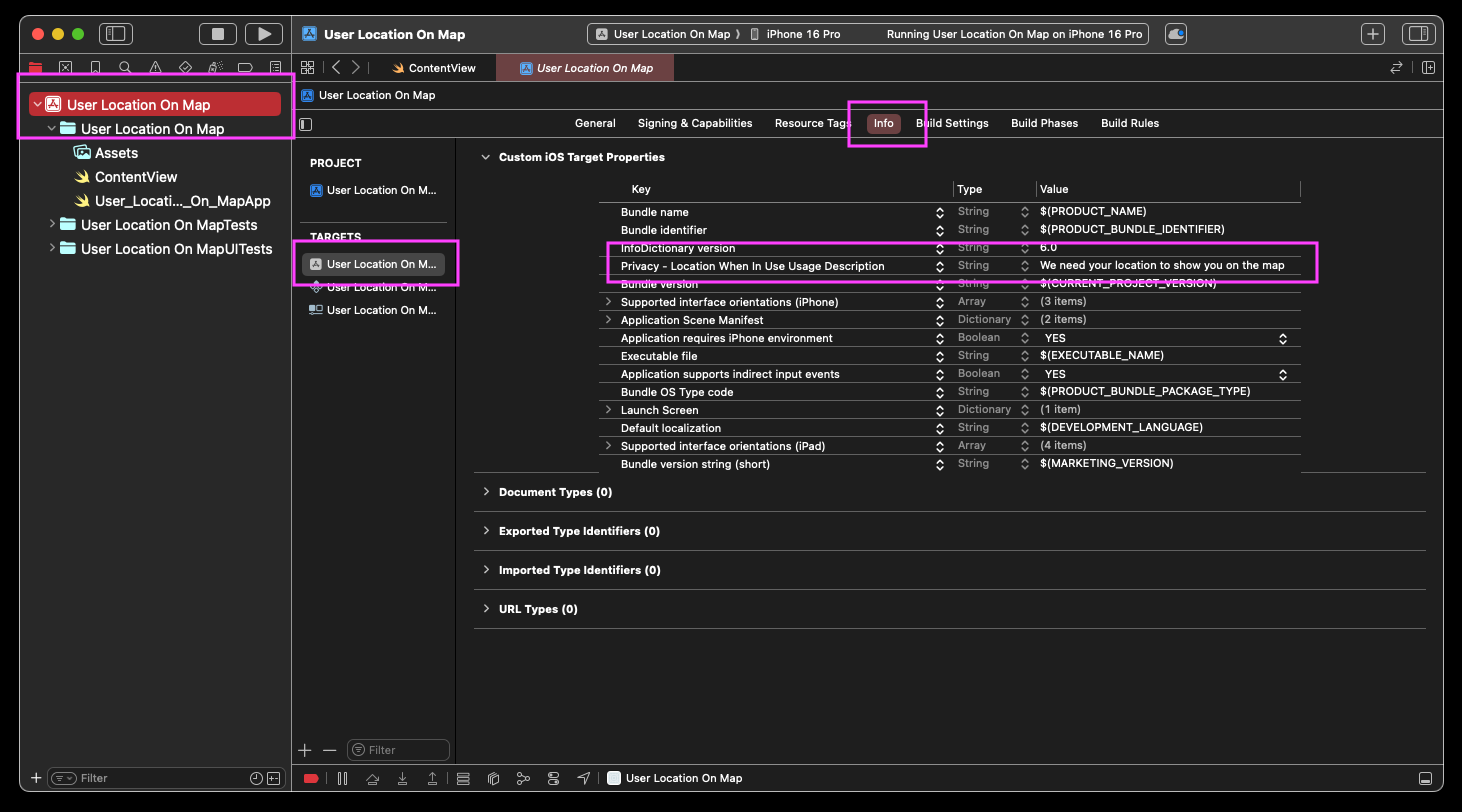 Next we will go to the Info.plist file and add a value for the "Privacy - Location When In Use Usage Description" key. This value explains why we need the user's location.